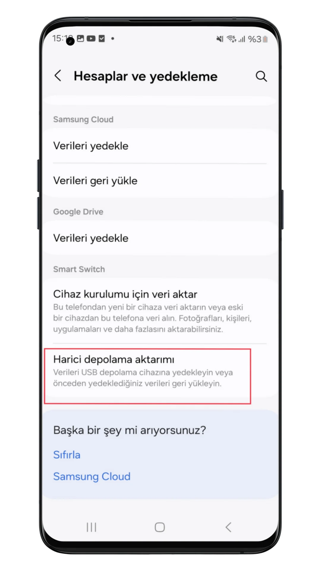 Samsung telefonlarda bulut sistemine yedeklemenin yanı sıra isterseniz USB üzerinden de yedekleme yapabiliyorsunuz. Farklı bir diske verilerinizi aktarıp daha sonradan tekrar telefona yükleme işlemini de gerçekleştirebiliyorsunuz. Eğer sürekli olarak şifrenizi unutan biriyseniz USB‘ye yedekleme yapmak mantıklı olabilir. Bu sayede bulut sistemi harici başka bir yerde de verilerinizi tutmuş ve güvenli bir şekilde saklamış olursunuz.